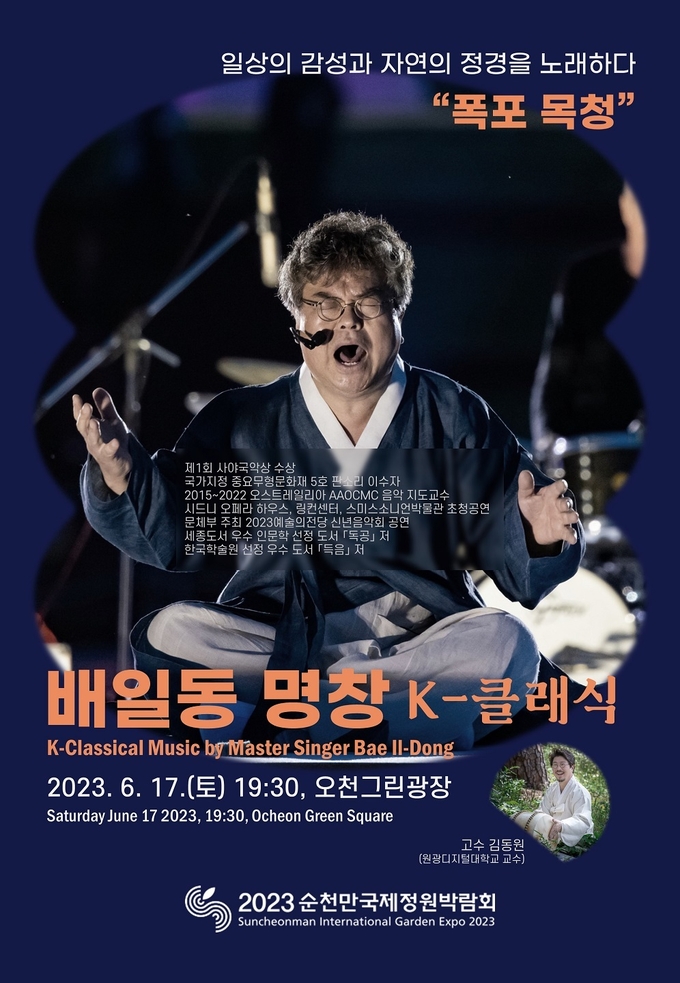순천 출신인 배일동 명창은 중요무형문화재 제5호 판소리 이수자로 크고 힘찬 소리를 지녀 ‘폭포 목청’이라는 별칭을 갖고 있다. 2023순천만국제정원박람회 홍보대사이기도 한 배 명창은 지난 5월, 오천그린광장에서 프로젝트 그룹 ‘지리(CHIRI)’의 크로스오버 콘서트를 펼쳐내며 “넓게 펼쳐진 오천그린광장 무대에 서서 고향인 순천을 바라보며 소리 가락에 감회를 토해냈다”라고 밝히기도 했다. 판소리와 재즈를 결합한 퓨전 음악은 많은 관람객들로부터 큰 호응을 얻었다.