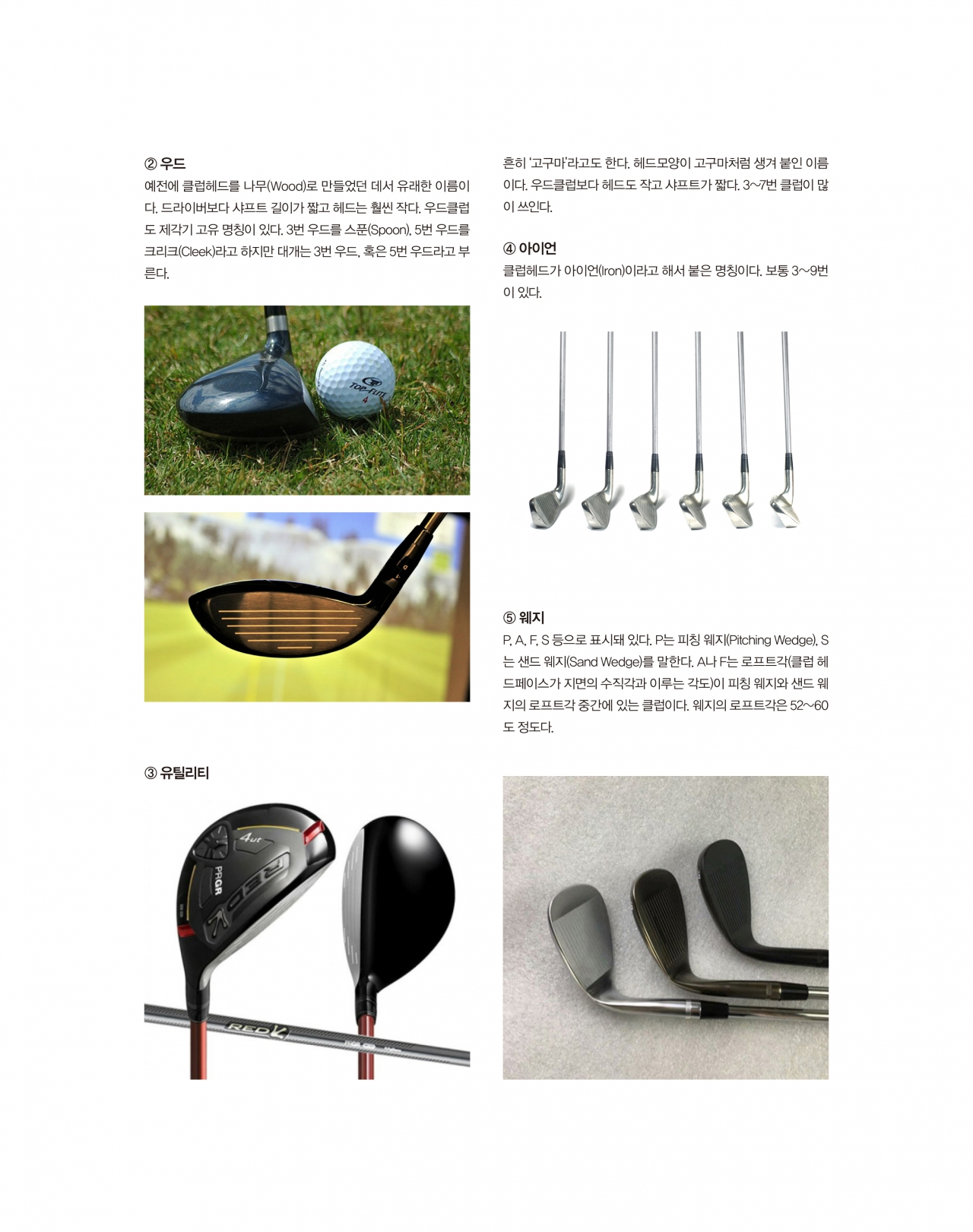 - 골프클럽은 드라이버와 우드, 아이언, 웨지, 퍼터로 나뉜다