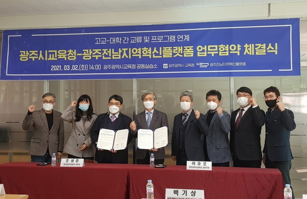 [광주=지이코노미] 신홍관 기자 = 광주시교육청이 2일 광주 직업계고와 광주전남 대학 간 직업계고 학점제 활성화를 위해 광주시교육청 공동실습소에서 ‘광주시교육청-광주전남지역혁신플랫폼 업무 협약’을 체결했다.