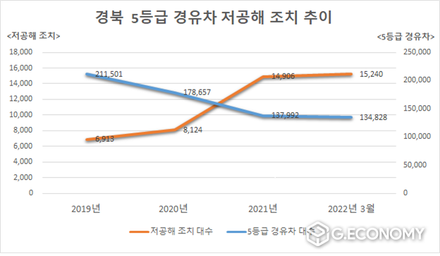 한편, 경북도는 그간 미세먼지 저감의 일환으로 노후 경유차 감축 사업을 지속해서 추진한 결과 2019년에 등록된 5등급 경유차는 21만대였으나, 올해 3월말 기준 13만대로 총 8만대 감축했고 저공해조치 차량도 1만5240대로 매년 증가하고 있다.