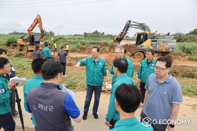 ▲명현관 군수 호우피해 복구현장점검(화원척북1제)/해남군 제공
