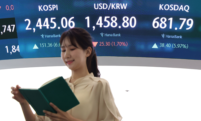 한국거래소에 따르면 이날 코스피 종가는 전 거래일 대비 151.36포인트(6.60%) 오른 2,445.06으로 집계됐다.