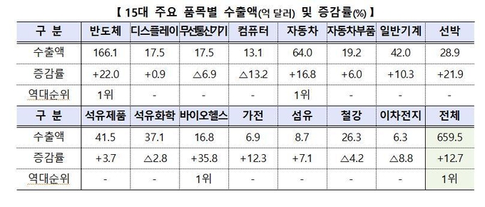 15대 주요 품목별 수출액 동향 이하 자료: 산업통상자원부 제공
