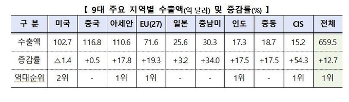 9대 주요 지역 중에서는 트럼프 행정부의 관세 영향을 직접적으로 받는 미국을 제외한 모든 지역에서 수출이 증가했다.