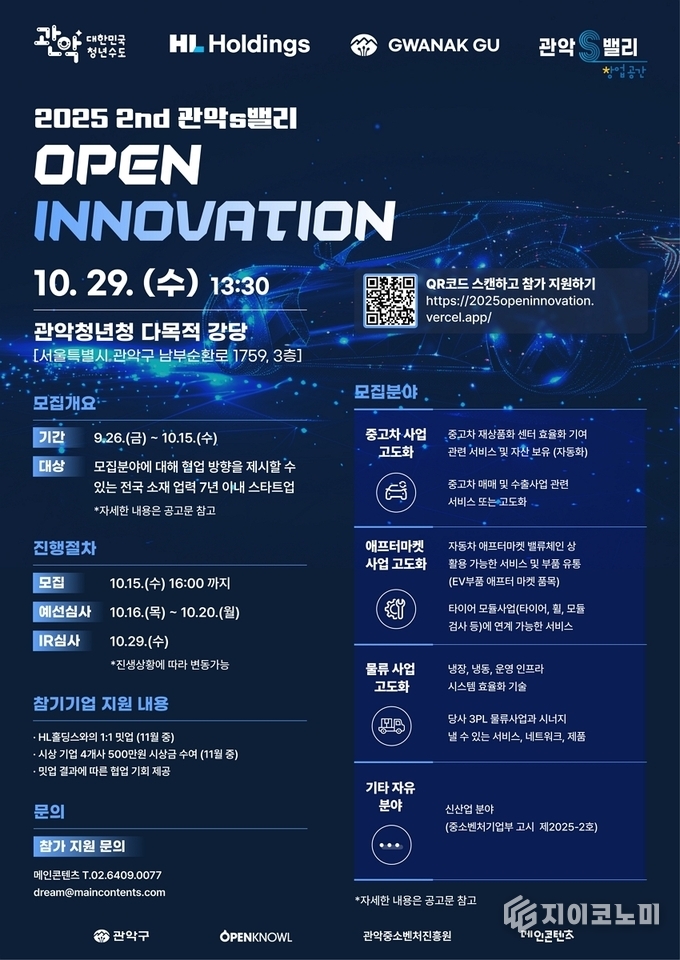 지이코노미 최영규 기자 | 관악구(구청장 박준희)가 자동차, 물류 분야 글로벌 네트워크를 보유한 ‘HL홀딩스’와 함께 ‘2025 제2회 관악S밸리 오픈 이노베이션’에 참가할 기업을 모집한다.