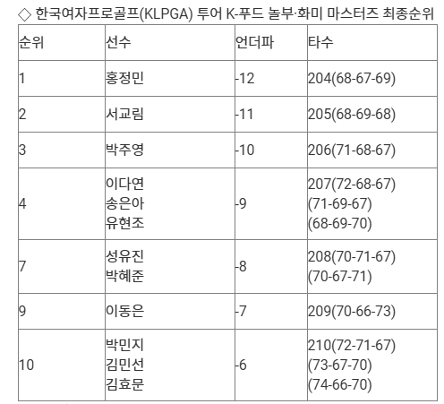 홍정민은 12일 경기도 용인 88컨트리클럽(파72·6,748야드)에서 열린 'K-푸드 놀부·화미 마스터즈(총상금 12억 원)' 마지막 날 3라운드에서 버디 4개, 보기 1개를 합해 3언더파 69타를 쳤다.