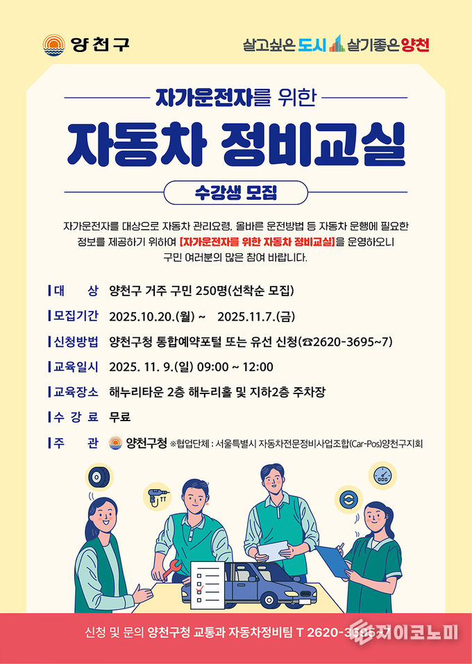 정비교실 참가 신청은 선착순 250명을 대상으로 10월 20일부터 11월 7일까지 진행되며, 참여를 원하는 주민은 누구나 양천구청 홈페이지 통합예약포털에서 신청하거나 교통과로 전화 접수하면 된다.