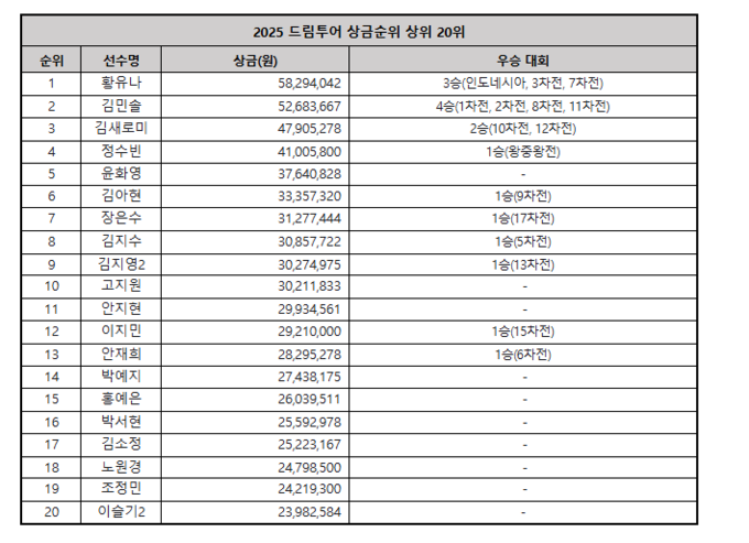 이로써 드림투어의 2025시즌이 모두 막을 내렸고, 2025 드림투어 상금왕의 영예는 올 시즌 3승을 거두며 꾸준한 경기력으로 상금 5,829만4,042원을 획득한 황유나(22)에게 돌아갔다. 황유나는 “시즌 초에 목표로 세웠던 ‘시즌 3승과 상금왕’을 모두 이룰 수 있어 정말 기쁘다. 도와주신 분들이 너무 많아 감사한 마음을 함께 나누고 싶다.”며 소감을 말했다.