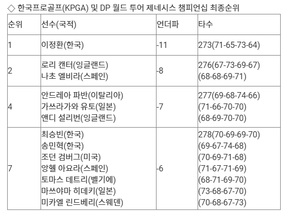 이정환은 이번 우승으로 대회를 공동 주관한 DP 월드투어 2년 출전권과 부상으로 제네시스 GV80 차량을 함께 받았다.