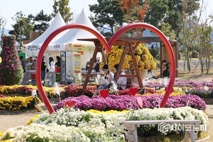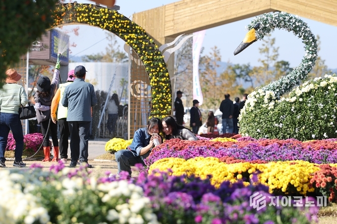 ▲특히 국화꽃정원은 형형색색 국화가 조화를 이루며 자연이 그린 가을 화폭을 떠올리게 했고, 곳곳에 마련된 포토존은 ‘인생샷 명소’로 인기를 끌었다. 강진군 제공
