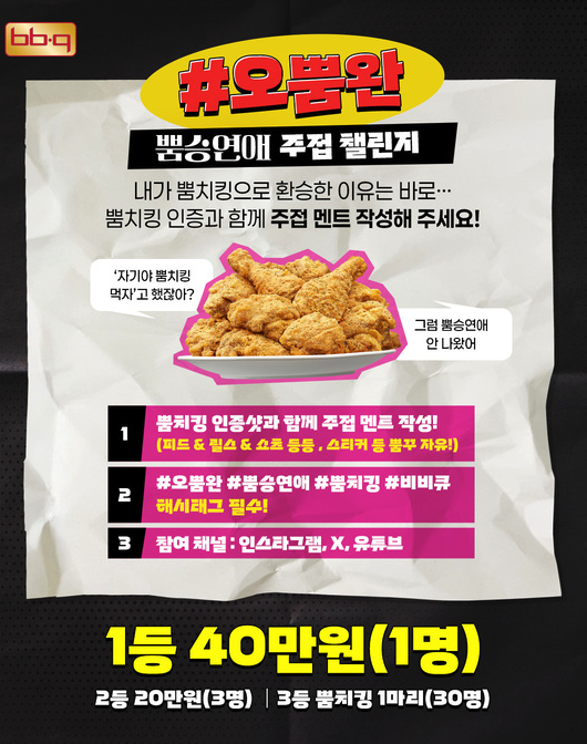 BBQ는 이번 챌린지를 통해 뿜치킹과 가장 좋은 조합의 세트를 찾는 것이 목표며, 1등에게는 100만원(1명)의 상금을, 2등(5명)에게는 20만원을, 3등(50명)에게는 뿜치킹 기프티콘을 증정한다.