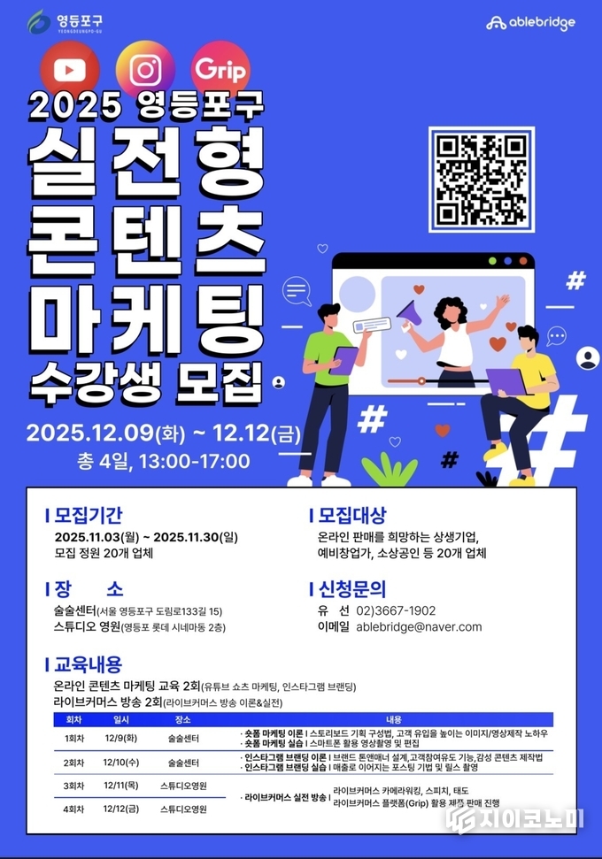 온라인 마케팅 교육은 오는 12월 9일, 10일 이틀간 술술센터에서 진행된다. △짧은 영상(숏폼) 구성 기획법 △고객 유입을 높이는 영상 제작법 △브랜드 이미지 설계법 △매출로 이어지는 온라인 게시 기법 등 실전 중심의 교육이 이뤄지며 실습을 통해 실무 적용 능력을 높일 예정이다.
