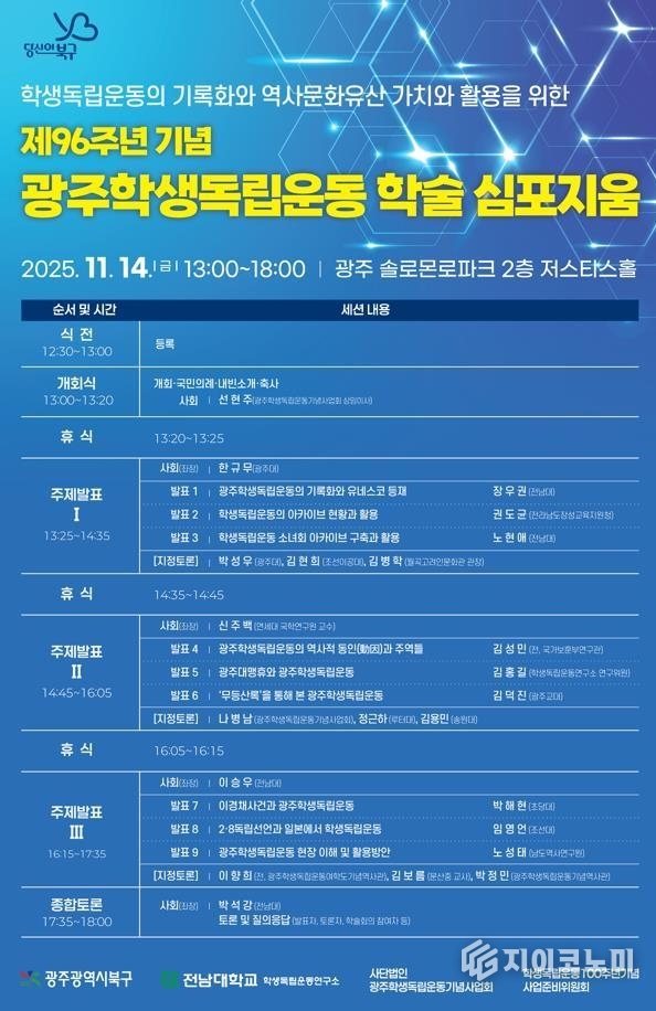 지이코노미 한정완 기자 | 광주광역시 북구(구청장 문인)가 오는 14일 광주 솔로몬로파크 저스티스홀에서 ‘학생독립운동 96주년 기념 학술 심포지엄’을 개최한다고 밝혔다.