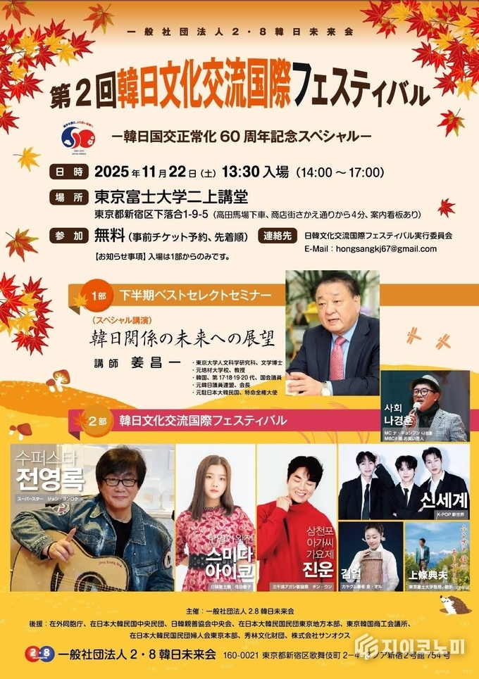 한일국교 정상화 60주년을 기념해 양국 국민이 함께 즐길 수 있는 대규모 문화축제 ‘제2회 한일교류 국제 페스티벌’이 오는 11월 22일(토) 오후 2시, 일본 도쿄에서 성대하게 열린다. 이번 행사는 일반 사단법인 2.8 한일미래회가 주최하며, 재일동포와 일본 시민을 위해 전석 무료 초대 공연으로 마련된다.