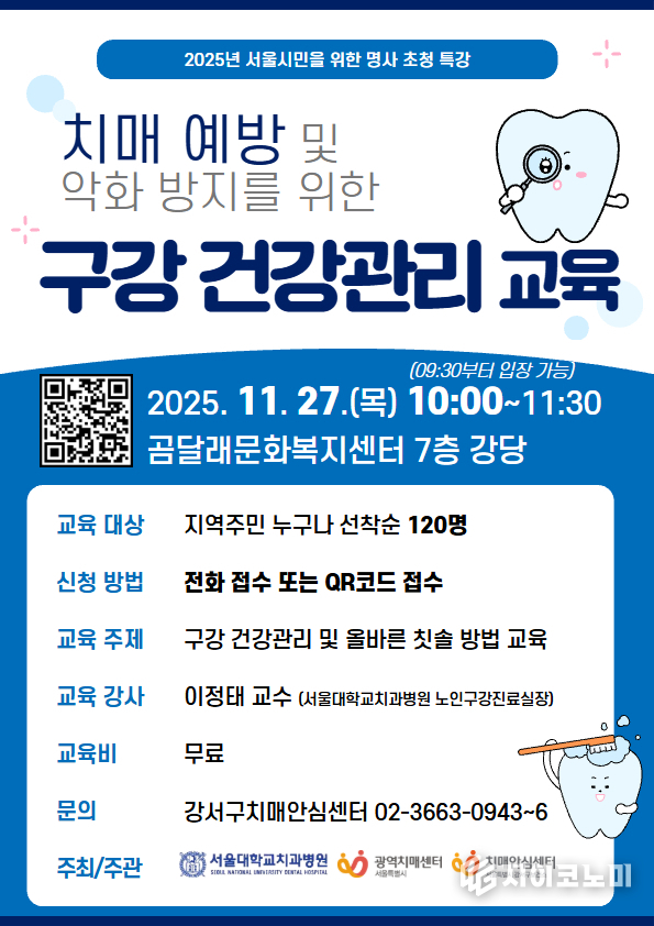 특강은 서울대학교치과병원 이정태 교수가 강사로 나서 ‘치아 손실과 치매의 연관성’, ‘올바른 구강건강 관리법’ 등을 주제로 강연할 예정이다.