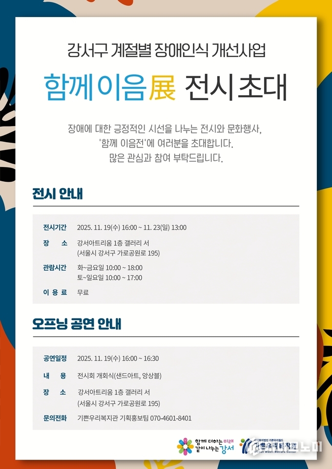 지이코노미 최영규 기자 | 서울 강서구(구청장 진교훈)는 ‘계절별 장애인식개선사업’의 일환으로 강서아트리움(가로공원로 195) 갤러리에서 전시회를 개최한다고 밝혔다.