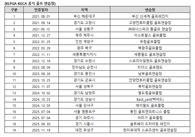 한편, KLPGA는 2021년 ‘부산 신세계 골프레인지’를 시작으로 전국 18곳의 골프 연습장을 ‘KLPGA-KGCA 공식 골프 연습장’으로 인증했으며, 지난해 9월에는 경기도 시흥시에 위치한 ‘솔트베이 드라이빙 레인지’를 18호로 선정해 인증식을 진행했다.
