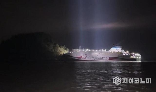 19일 오후 8시 17분께 신안군 장산도 남방 족도 인근을 지나던 퀸제누비아2호가 암초에 걸려 움직임이 멈췄고, 신고를 받은 해경이 즉시 구조에 나섰다.