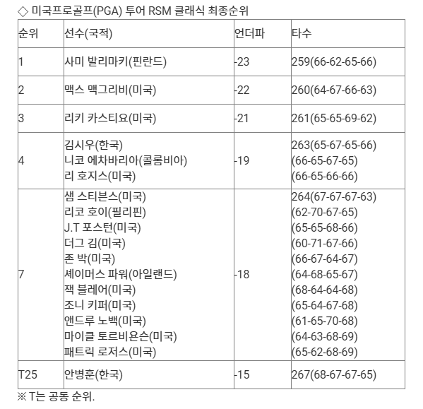 DP 월드투어 2승이 있는 발리마키는 핀란드 국적 선수 최초의 PGA 투어 대회 우승자가 됐다. 이번 대회 우승 상금은 126만 달러(약 18억5,000만 원)다.