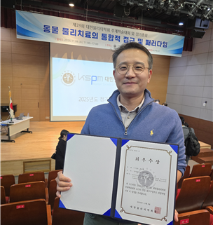 이번 수상작은 ‘Analysis of Gait Pattern and Peak Vertical Force in Small Sized Dogs with Forelimb Lameness (소형견 앞다리 파행 시 보행 패턴 및 수직 지면반발력 분석)’으로, 동물 재활 물리치료 분야의 기초 데이터를 제공하며 학계 및 임상 현장의 큰 관심을 받았다.