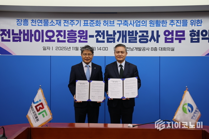 24일 열린 협약식에서는 장충모 전남개발공사 사장과 윤호열 전남바이오진흥원 원장이 직접 자리해, ‘장흥 천연물소재 전주기 표준화 허브 구축사업’을 본격 추진하기 위한 협력 구조를 공식화했다.
