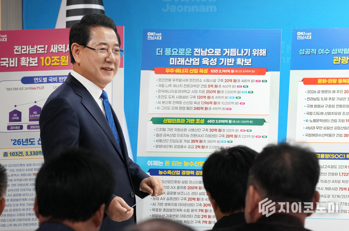 김영록 지사는 “AI 데이터센터, RE100 산단 조성, 민간 우주산업 선도사업, 전남형 농산업AX 등 다양한 분야에서 국비를 확보해 역대 최대인 국고 10조 원 시대를 활짝 열었다”며 “미래 전남 황금시대롤 힘차게 열기 위해 더욱 노력하겠다”고 강조했다.