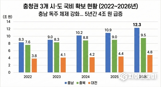 지이코노미 정길종 기자 |충청권 국비 확보 경쟁에서 충청남도가 사실상 독주 체제에 돌입했다. 충남언론협회가 최근 5년(2022~2026년) 국비 확보액을 분석한 결과, 충남은 매년 조(兆) 단위 기록을 연이어 경신하며 충북·대전을 압도한 것으로 나타났다. ‘충청 맏형’이라는 수식이 더 이상 비유가 아닌 현실로 굳어진 셈이다.