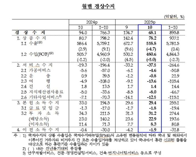 다만 올해 들어 10월까지 누적 경상수지 흑자(895억8,000만 달러)는 지난해 같은 기간(766억3,000만 달러)보다 약 17% 많은 상태다.