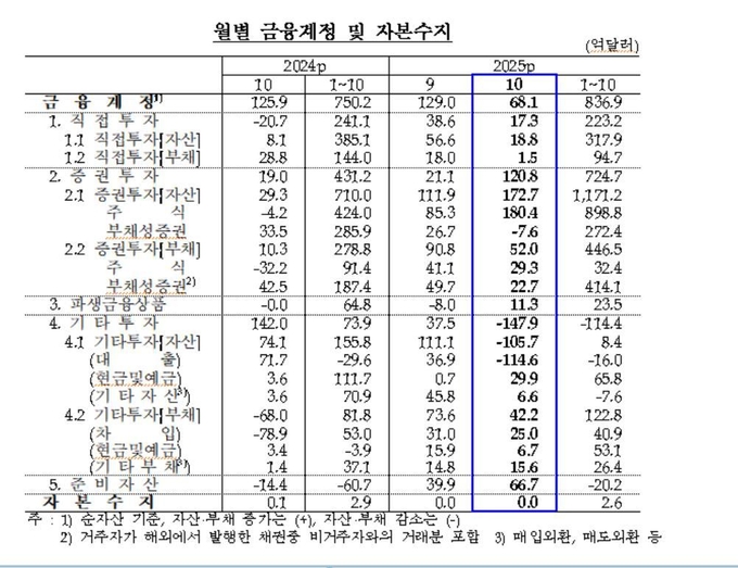 금융계정 순자산(자산-부채)은 10월 중 68억1,000만 달러 늘었다.