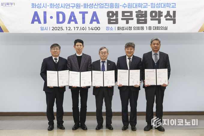 지이코노미 최영규 기자 | 화성특례시(시장 정명근)는 지난 17일 화성시의회 대회의실에서 화성시연구원(이하 연구원), 화성산업진흥원(이하 진흥원), 수원대학교, 협성대학교와 ‘AI·데이터 기반 관·학·연 협력 생태계 조성을 위한 업무협약’을 체결했다.