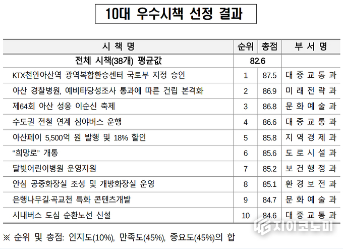 선정된 10대 우수시책은 △KTX천안아산역 광역복합환승센터 국토교통부 지정 승인 △아산 경찰병원 예비타당성조사 통과에 따른 건립 본격화 △제64회 아산 성웅 이순신축제 △수도권 전철 연계 심야버스 운행 △아산페이 5,500억 원 발행 및 18% 할인 △희망로 개통 △달빛어린이병원 운영 지원 △안심 공중화장실 조성 및 개방화장실 운영 △은행나무길·곡교천 특화 콘텐츠 개발 △시내버스 도심 순환노선 신설 등이다.
