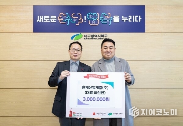 한재산업개발(주)(대표 여인현)은 지난 18일 북구 지역 저소득층 지원을 위해 성금 300만 원을 북구청에 기탁했다. 이날 전달식에는 지형재 부구청장과 여인현 대표가 참석해 지역 내 나눔문화 확산과 상생 방안에 대해 뜻깊은 대화를 나눴다.