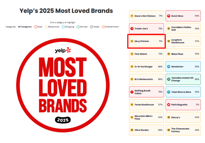 이번 옐프가 발표한 ‘가장 사랑받는 브랜드’ 순위는 브랜드 평점, 재방문 고객 평가, 브랜드 검색량, 리뷰 수 등을 종합 분석해 선정됐다. BBQ는 이 평가에서 높은 소비자 만족도와 브랜드 호감도를 인정받으며 전체 3위에 올랐다.