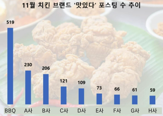 지난 11월 BBQ 치킨의 '맛있다' 키워드 포스팅 수는 총 519건으로 집계되며 9개 브랜드중 최고점을 차지했다. 전체 포스팅 수 1,444건 중 약 35.9%에 해당하는 수치로, BBQ는 2위를 기록한 브랜드와 비교해도2배 이상 높은 압도적인 수치로 1위에 기록했다.