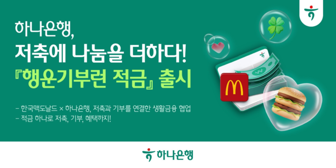 지이코노미 강권철 기자 | 하나은행(은행장 이호성)은 기부문화 활성화를 위한 ESG 특화 금융상품 「행운기부런 적금」을 출시했다고 밝혔다. 「행운기부런 적금」은 하나은행과 한국맥도날드의 생활금융 협력의 첫 결실로, 저축과 나눔이 자연스럽게 이어지는 따뜻한 손님 참여 경험을 제공하는 상품이다. 적금 만기 시 손님이 선택한 일정 금액이 기부로 연계되어 사회적 가치 창출에 기여할 수 있도록 설계된 것이 특징이다.