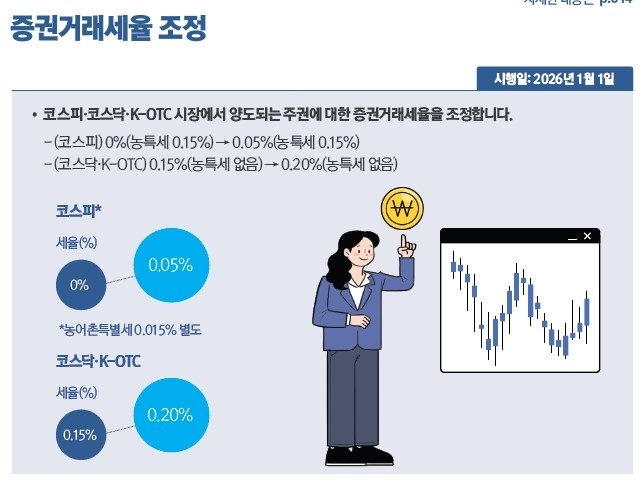코스닥·K-OTC 시장(농특세 없음)은 0.15%에서 0.20%로 각각 조정된다.