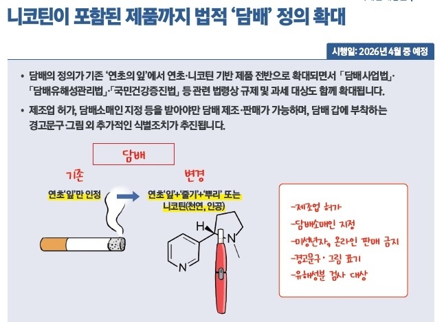담배의 정의는 기존 천연니코틴 원료인 '연초의 잎'에서 '연초' 또는 '니코틴'이 포함된 모든 제품으로 확대된다. 그간 규제의 사각지대로 지적됐던 액상형 전자담배도 기존 궐련형 담배와 동일한 규제를 받게 된다.