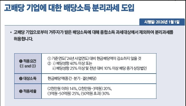 고배당 상장법인으로부터 받은 배당소득은 고율의 종합소득 과세 대상에서 제외된다. 배당소득 2,000만 원까지 14%, 2,000만 원 초과∼3억 원 이하 20%, 3억 원 초과∼50억 원 이하 25%의 세율을 적용하고 50억 원 초과 구간을 신설해 최고 30% 세율을 부과한다.