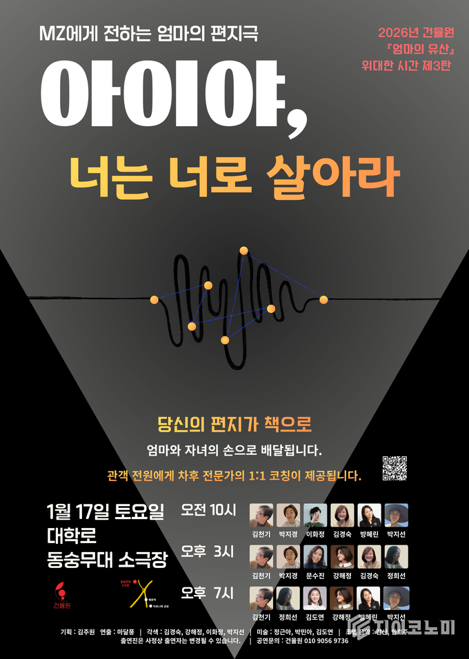 지이코노미 강매화 기자 | 한 통의 편지에서 시작된 이야기가 마침내 무대 위에 오른다. 김주원 박사가 아들에게 쓴 편지를 계기로 출간된 『엄마의 유산』이 국내 최초 ‘엄마의 편지극’이라는 새로운 형식으로 관객을 만난다. 공연 [아이야, 너는 너로 살아라]는 오는 2026년 1월 17일, 대학로 동승무대 소극장에서 단 하루 펼쳐진다.