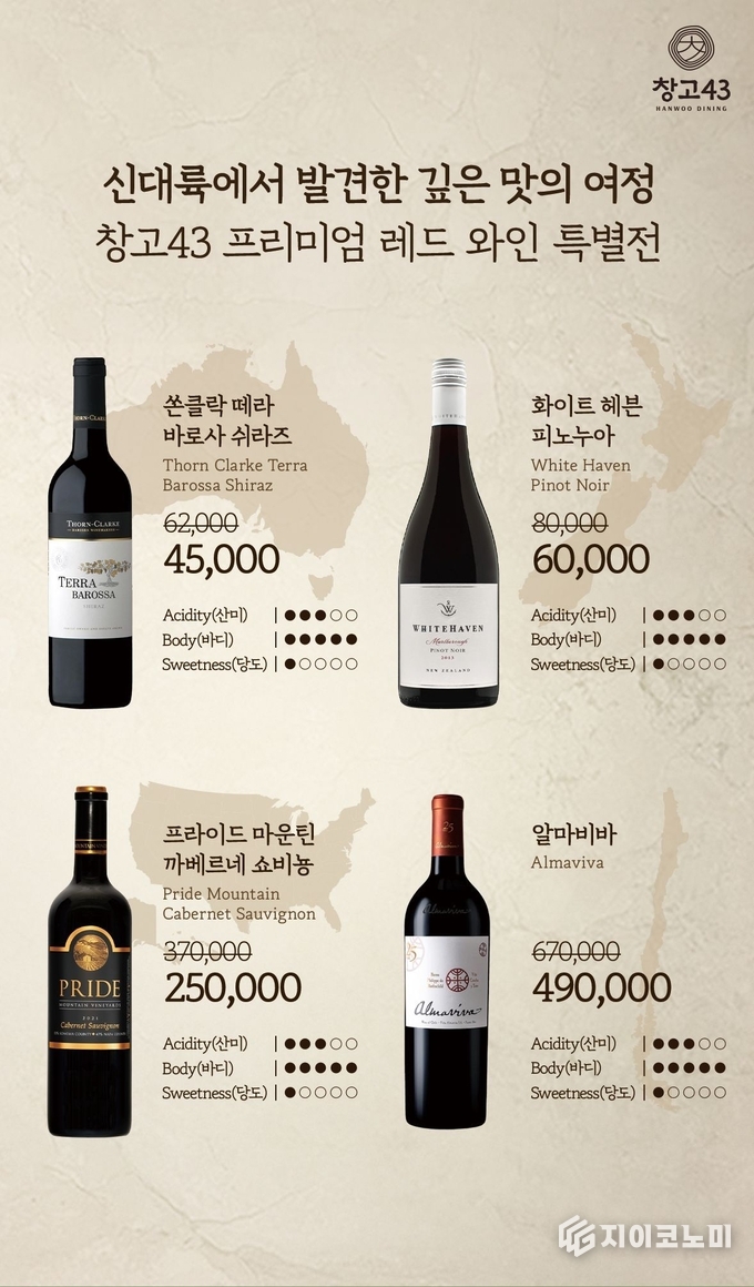 이번 프로모션은 1월과 2월, 두 달간 전국 창고43 매장에서 진행된다. 행사 대상 와인은 뉴질랜드 ‘화이트 헤븐 피노누아’, 호주 ‘쏜클락 떼라 바로사 쉬라즈’, 미국 ‘프라이드 마운틴 빈야드 까베르네 쇼비뇽’, 칠레 ‘알마비바’ 등 신대륙을 대표하는 레드와인 4종이다. 정상가 대비 최대 32%까지 할인된 가격에 제공돼, 프리미엄 와인을 합리적인 수준에서 접할 수 있도록 구성됐다.