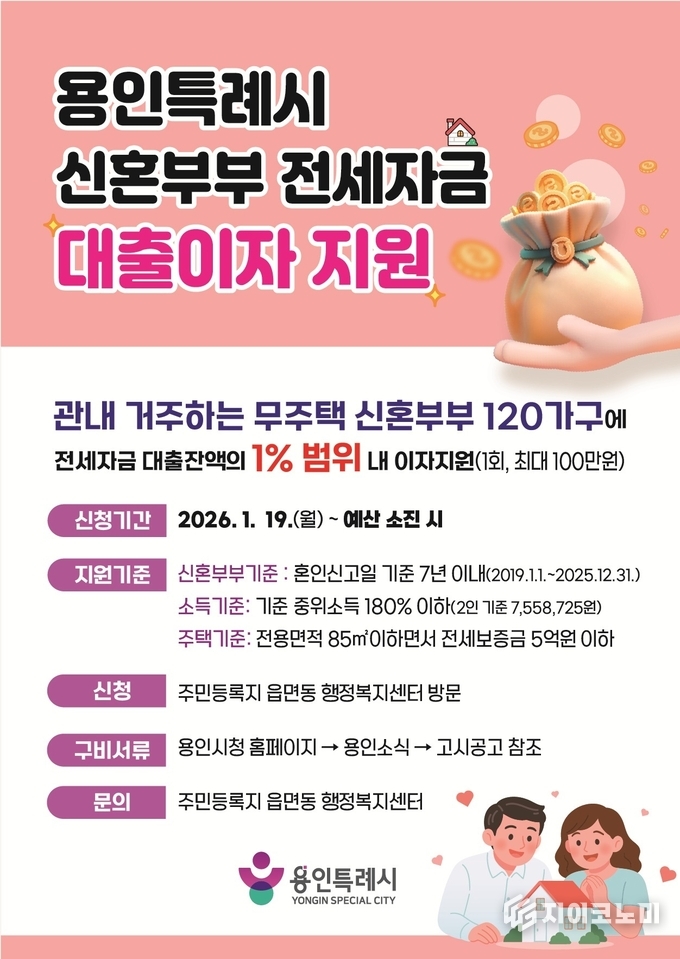 지이코노미 최영규 기자 | 용인특례시(시장 이상일)는 신혼부부의 주거비 부담을 낮추고 안정적으로 정착하는 것을 지원하기 위해 ‘신혼부부 전세자금 대출이자 지원사업’ 신청자를 모집한다고 12일 밝혔다.