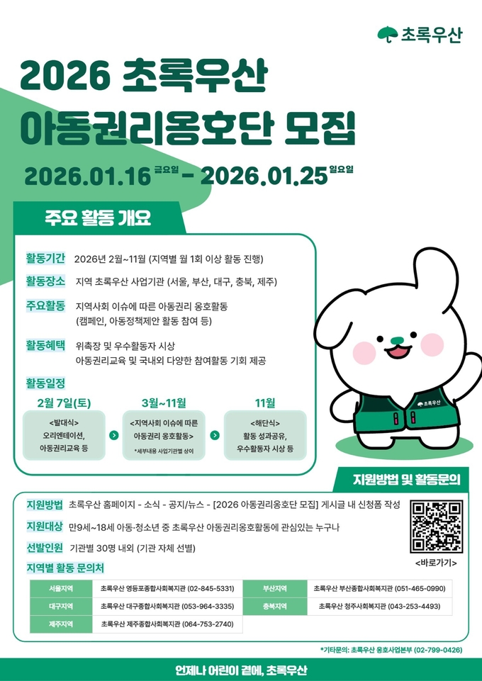 이번 모집은 서울, 부산, 대구, 충북, 제주 등 총 5개 지역에서 진행된다. 만 9세부터 18세 사이의 아동·청소년 중 아동권리 증진에 관심 있는 사람이라면 누구나 지원할 수 있다. 접수 기간은 오늘(16일)부터 25일까지이며, 초록우산 공식 홈페이지를 통해 신청이 가능하다.