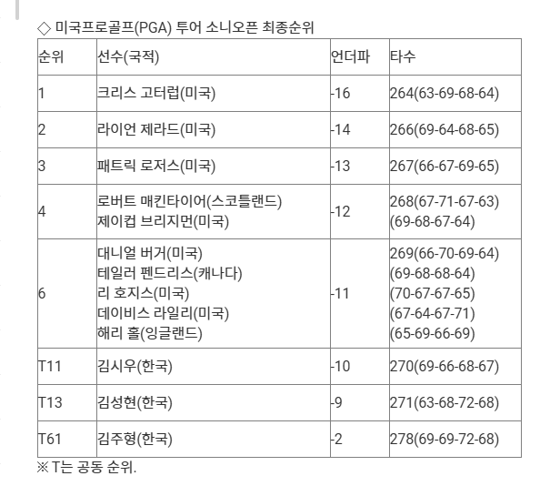 지난해 2부 콘페리 투어에서 뛰고 올해 1부로 복귀한 김성현은 최종 라운드에서 2 타를 줄여 마쓰야마 히데키(일본), 지난해 우승자 닉 테일러(캐나다) 등과 공동 13위(9언더파 271타)에 올랐다.