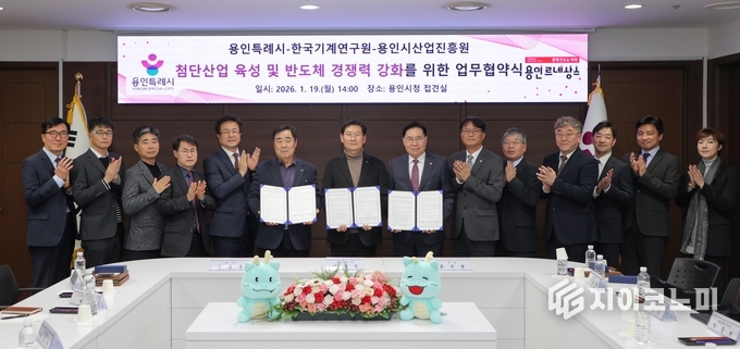 지이코노미 최영규 기자 | 용인특례시(시장 이상일)는 19일 시청 접견실에서 한국기계연구원(KIMM), 용인시산업진흥원과 ‘첨단산업 육성 및 반도체 경쟁력 강화를 위한 업무협약’을 체결했다.