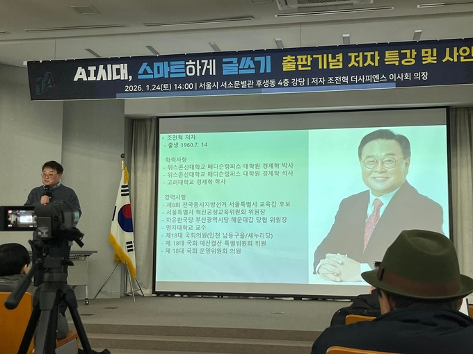 지이코노미 이창희 기자 | 조전혁 前국회의원이 24일 서울시 서소문별관 후생동 강당에서 신간 'AI 시대 스마트하게 글쓰기' 출판기념회와 특강을 열고, 인공지능 시대 교육의 방향과 핵심 역량으로 말의 힘과 글쓰기를 강조했다.