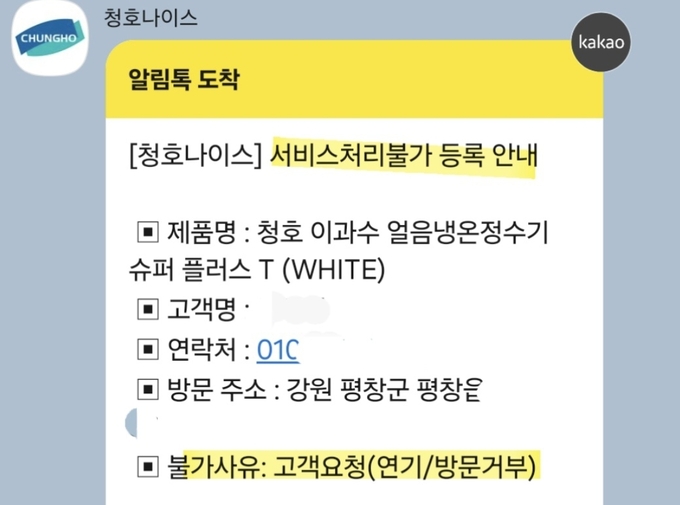 더 논란이 된 장면은 그 다음 날 벌어졌다. 그동안 반환·회수 문제에 대해서는 유독 더디던 청호나이스가, 이번에는 카카오톡 메시지로 ‘서비스 처리 불가’ 안내를 즉시 발송했다. 불가 사유는 다름 아닌 ‘고객 요청’으로 기재돼 있었다.