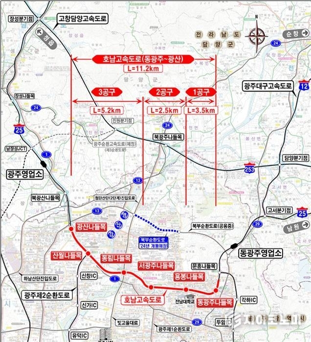 호남고속도로 확장사업에는 총 7934억 원이 투입된다. 동광주IC~용봉IC~서광주IC~동림IC~산월IC~광산IC로 이어지는 구간의 교통 흐름 개선이 핵심이다. 광주 도심 주요 간선도로의 병목 현상과 상습 정체 해소를 목표로 하고 있다.