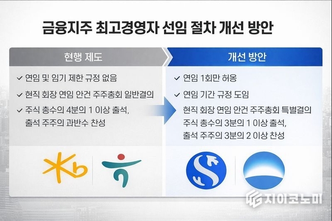 연임 요건도 강화될 전망이다. 현재 금융지주 회장 연임은 일반결의 사항으로, 출석 주주의 과반 찬성과 발행주식 총수의 4분의 1 이상 출석 요건만 충족하면 가능하다. 그러나 개편안이 도입되면 연임 시 주주총회 특별결의를 거치도록 하는 방안이 유력하다. 특별결의로 전환될 경우 발행주식 총수의 3분의 1 이상이 출석하고, 출석 주주의 3분의 2 이상 찬성을 얻어야 한다.