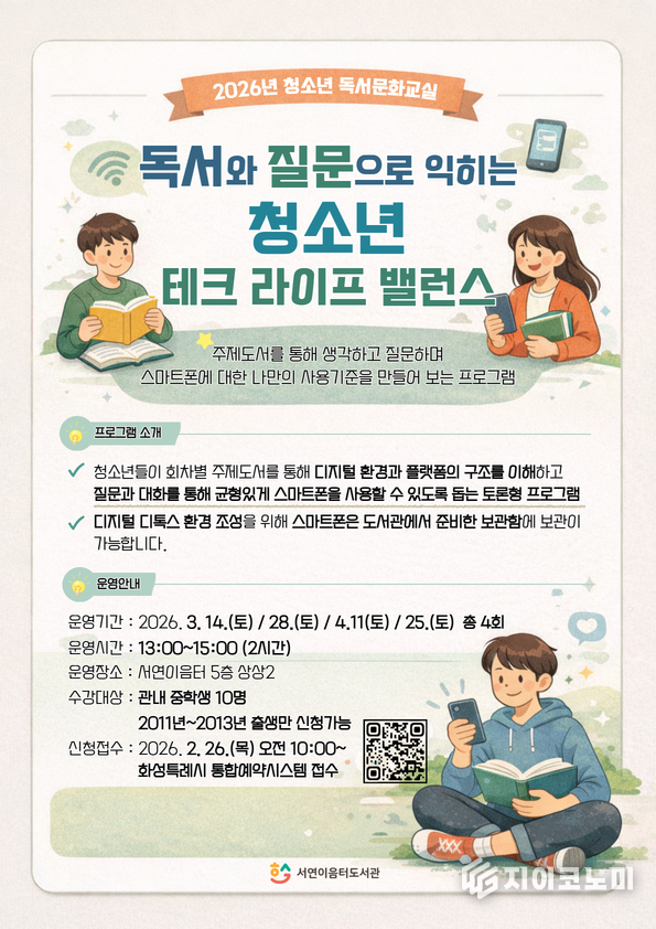 지이코노미 최영규 기자 | 화성시인재육성재단(대표이사 임선일) 서연이음터도서관은 오는 3월 14일(토)부터 4월 25일(토)까지 총 4회에 걸쳐 관내 청소년을 대상으로 한 독서문화교실 「독서와 질문으로 익히는 청소년 테크 라이프 밸런스」 프로그램을 운영한다고 밝혔다.