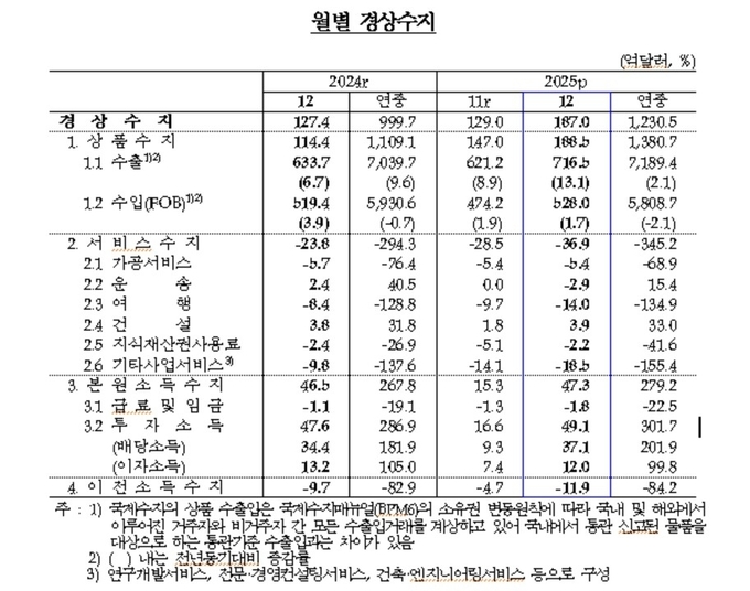 한국은행이 6일 발표한 국제수지 잠정 통계에 따르면 지난해 12월 경상수지는 187억 달러(약 27조5,000억 원) 흑자로 집계됐다. 월간 기준으로 사상 최대다.